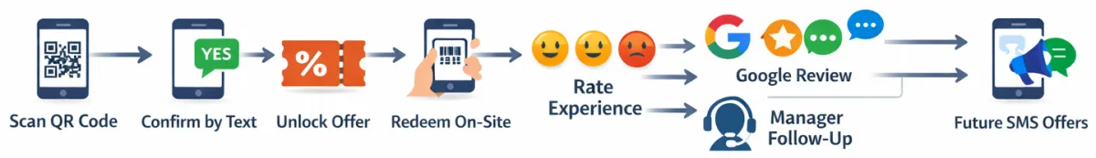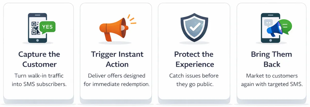 Revisitr helps local businesses turn on-site traffic into SMS subscribers, instant offer redemptions, repeat visits, better reviews, and direct recovery opportunities before unhappy experiences go public.